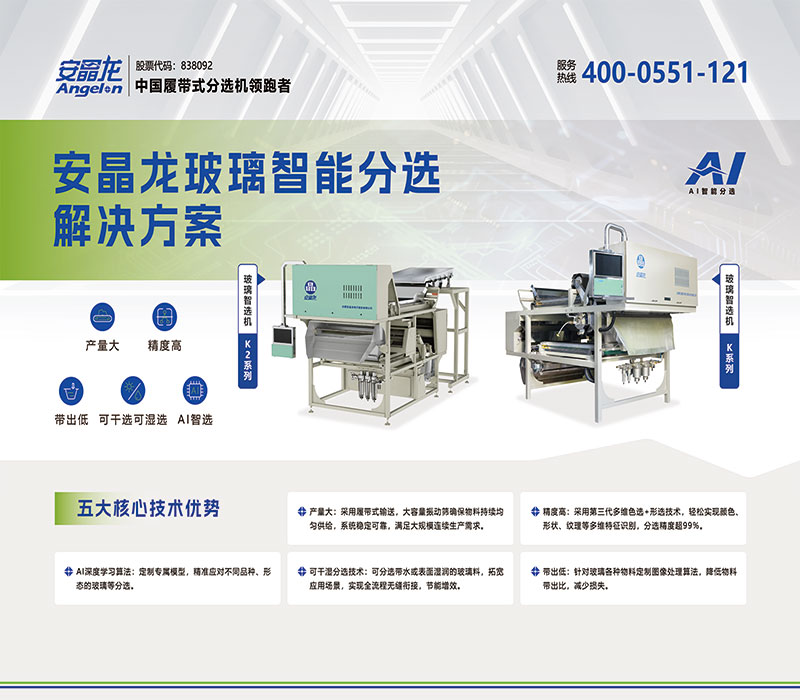 安晶龙深度洞察这一行业痛点,凭借其在首创履带式输送、光学识别、AI模型算法、高速喷阀控制等领域的深厚技术积累,为玻璃行业量身打造了专业化、智能化的色选解决方案,研发制造出玻璃智选机-K系列和K2系列,助力企业实现降本、增效、提质的三重目标。