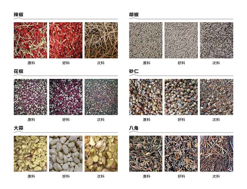 ❖ 香辛料:有效剔除花椒黑籽、八角枯瓣、砂仁蛀粒等,颗粒整齐无杂质