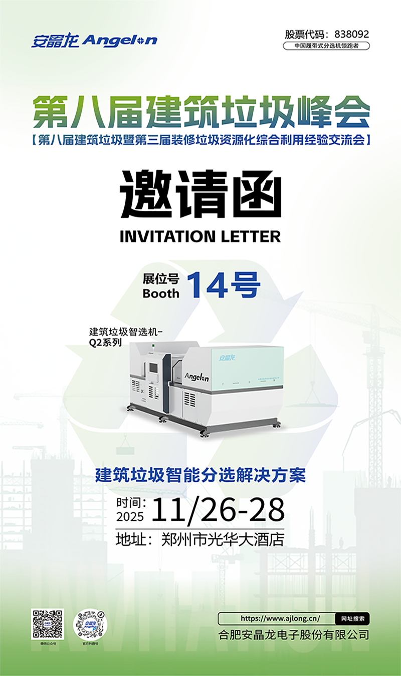 2025年11月26日至28日,第八届建筑垃圾暨第三届装修垃圾资源化综合利用经验交流会将于郑州隆重举行。安晶龙作为本次峰会的“老朋友”,将携建筑垃圾智能化分选解决方案亮相本次行业盛会,展位号:14。现场将展示针对复杂成分垃圾的高效精准分选技术,为提升资源化利用率、推动行业绿色低碳发展注入专业动力。